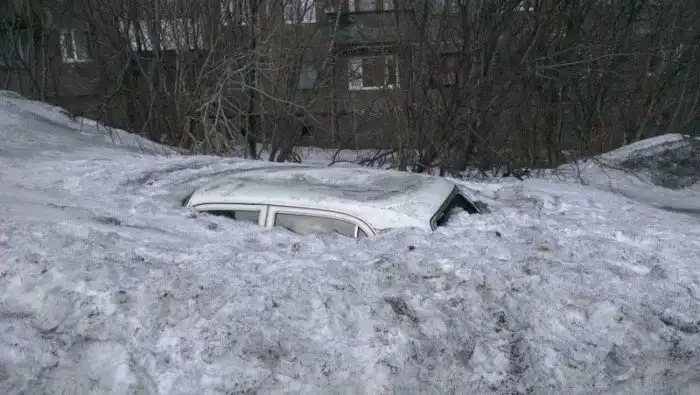 Эту машину, занесенную снегом, не заметили дорожники и начали снег убирать. Машина восстановлению не подлежит
