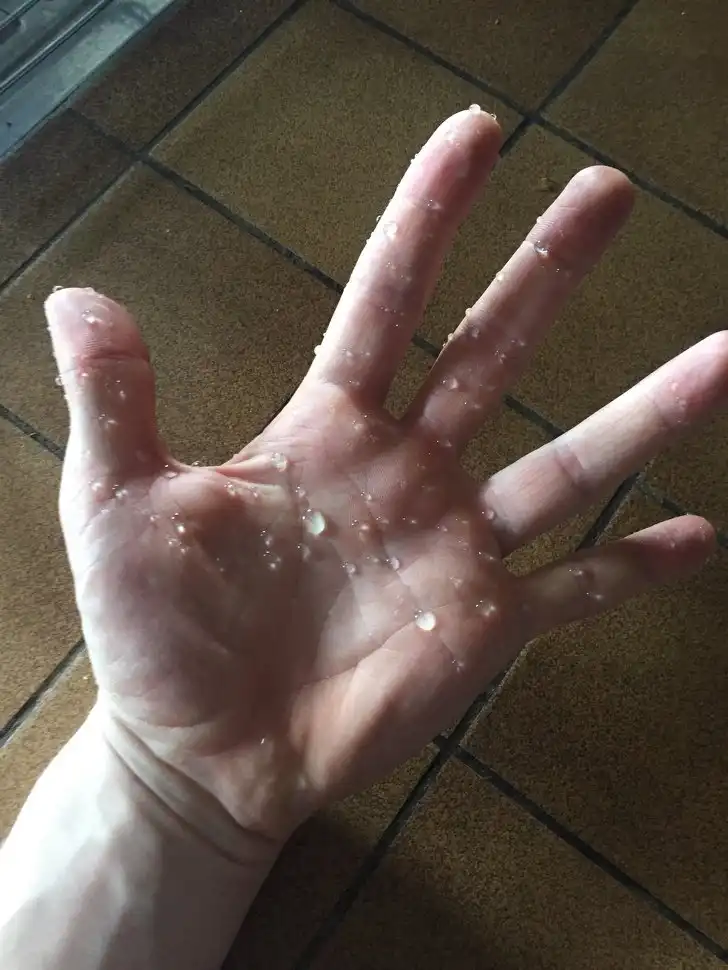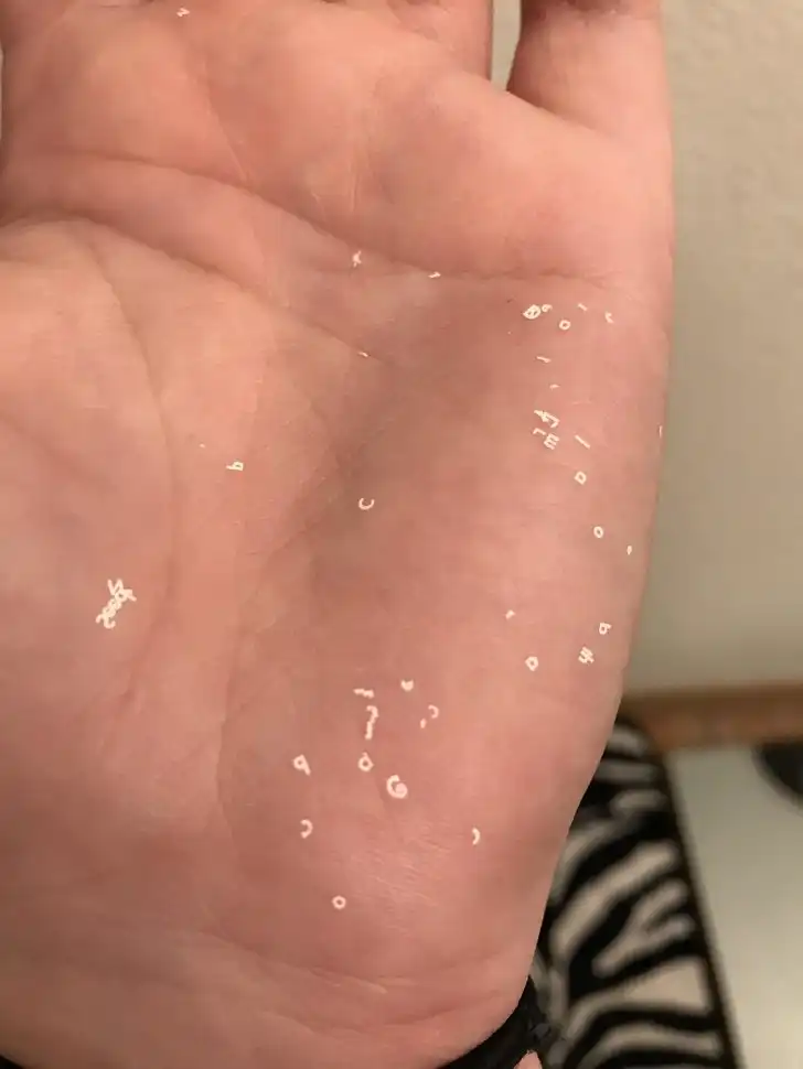 «После того как подержал в руках бутылку шампуня, на коже остались буковки с этикетки»