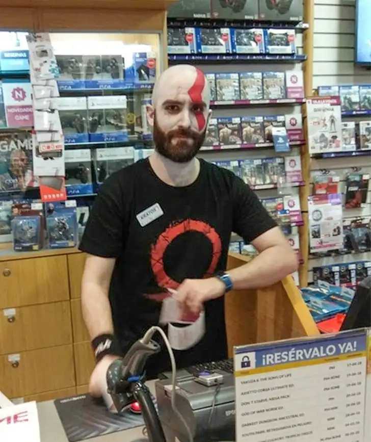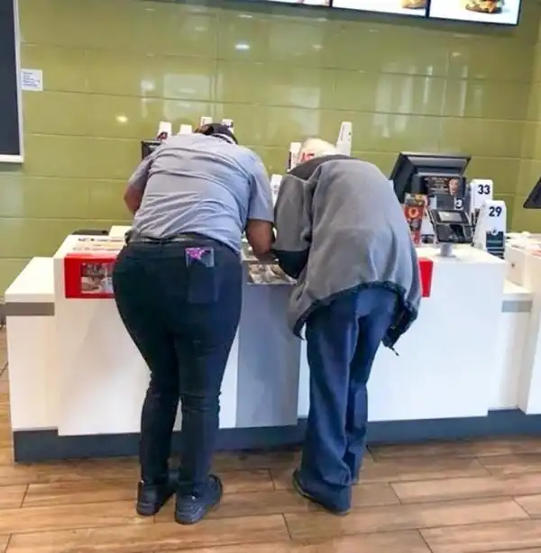 Работник фастфуда помогает пожилому мужчине установить на телефон гугл-карты и следовать за навигатором