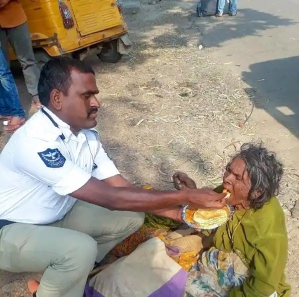Автоинспектор в Индии кормит ослабленную бездомную женщину