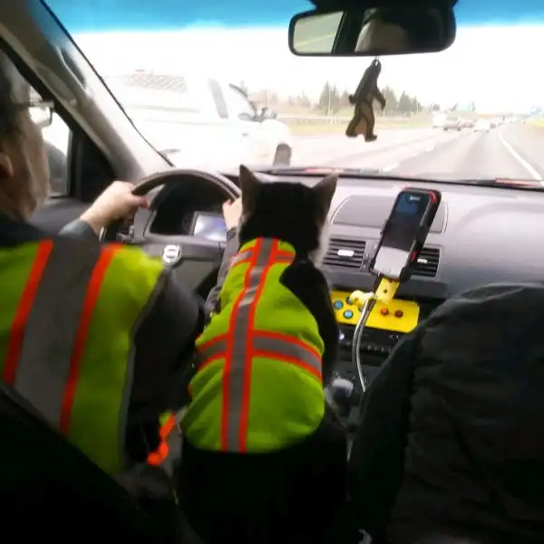 Водитель эвакуатора берет с собой на работу своего котика и надевает на него милый защитный жилет