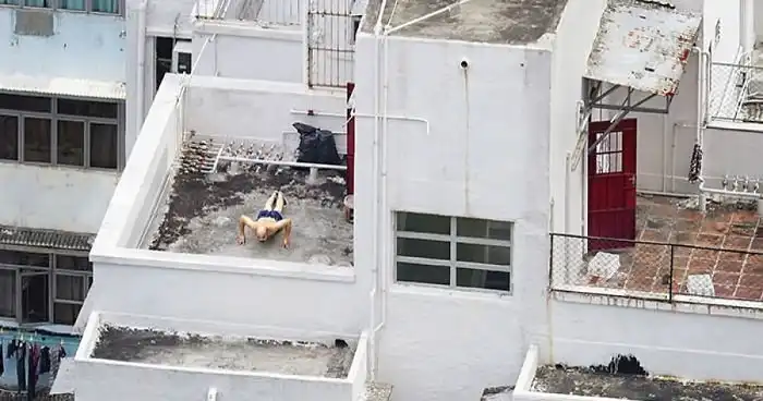 6. "Отжимания". Мужчина делает физические упражнения на крыше дома