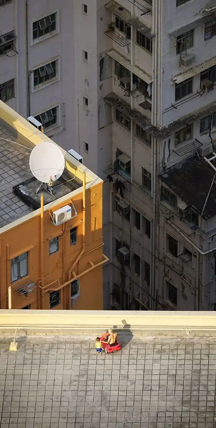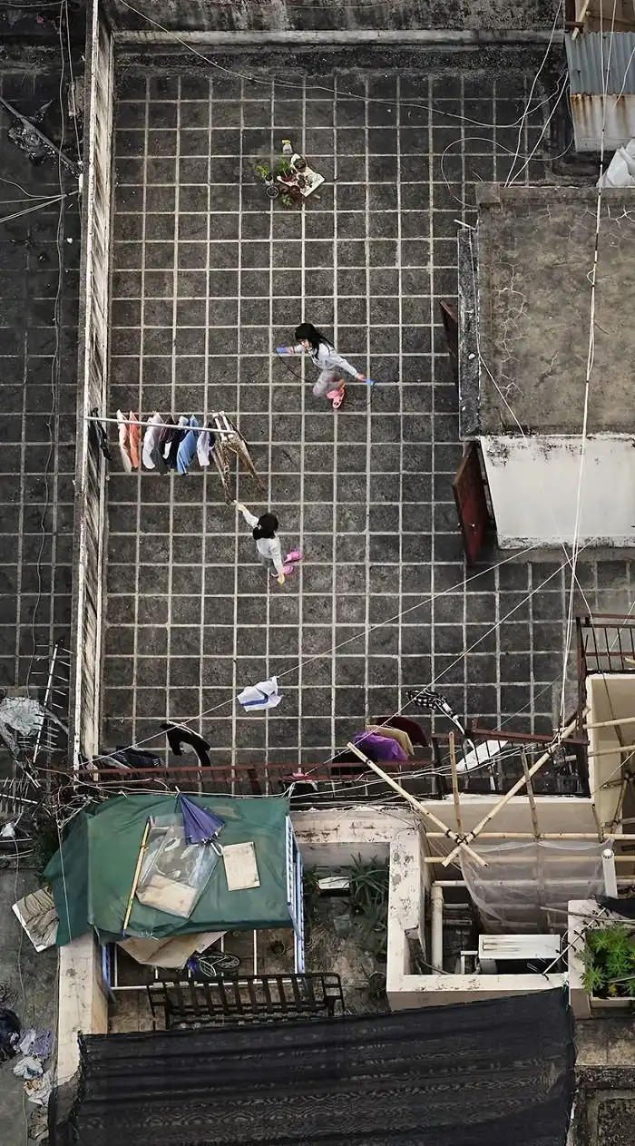 7. "Жизнь в розовом и сером". Две маленькие девочки прыгают через скакалку на крыше