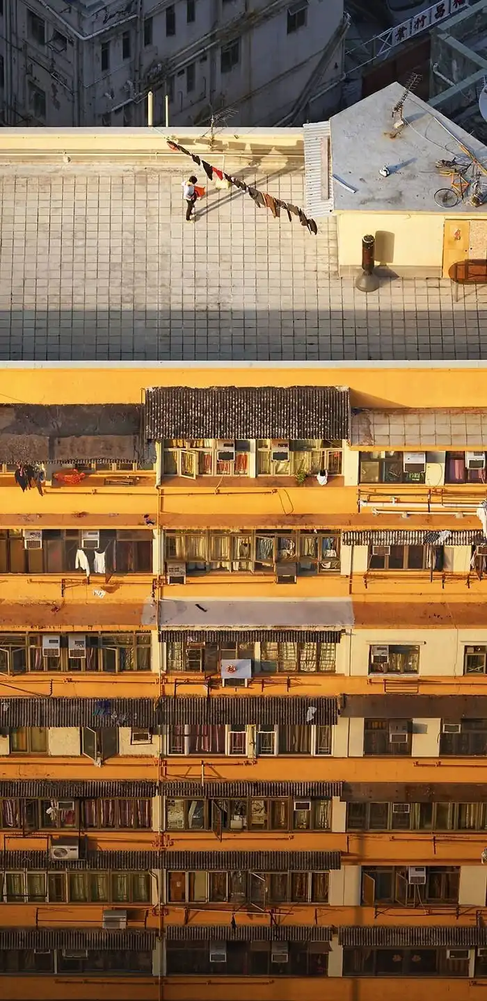 5. "Бетонный каньон". Женщина собирает высохшее белье на своем балконе