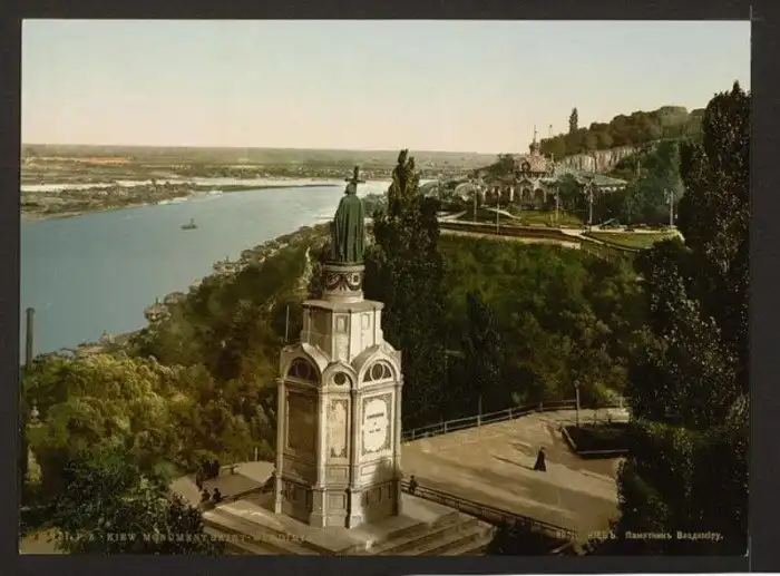 Владимирская горка и памятник Св.Владимиру, вид на Купеческий сад и летнее здание Купеческого собрания