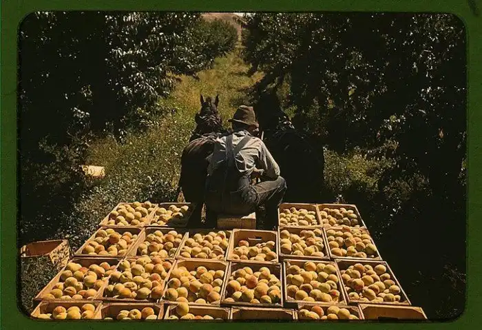 Перевозка ящиков с персиками из сада на перегрузочный склад в конце 1940 года в округе Дельта, штат Колорадо.