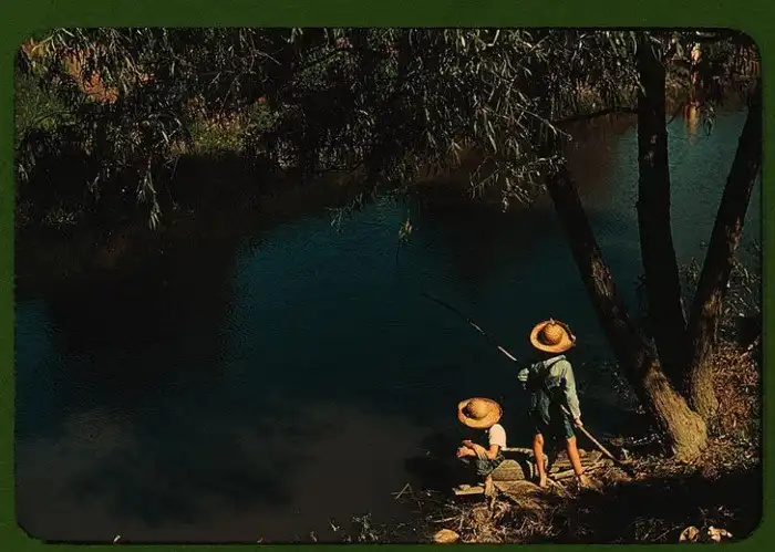 Мальчики рыбачат в заводи в Шривере, штат Луизиана, летом 1940 года. Дети из этнической группы каджунов находятся рядом со школой в Терребонне, проекте Администрации США по защите фермеров.