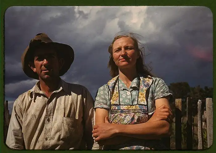 Фермеры-поселенцы Фаро и Дорис Кодилл в Пай-Тауне, штат Нью-Мексико, конец 1940 года.