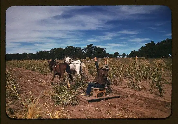 Сбор молодой кукурузы на поле Джима Норриса в Пай-Тауне в конце 1940 года, штат Нью-Мексико.