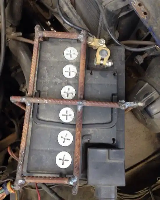 Вытащить аккумулятор из старенького автомобиля марки ВАЗ не составляет особого труда, а потому многие автолюбители предпринимают попытки защиты аккумулятора. На фото далее одна из подобных попыток.