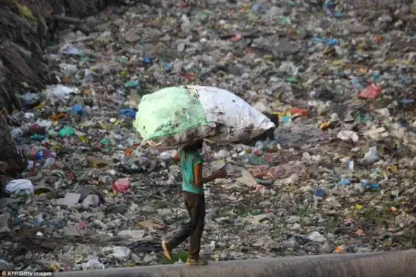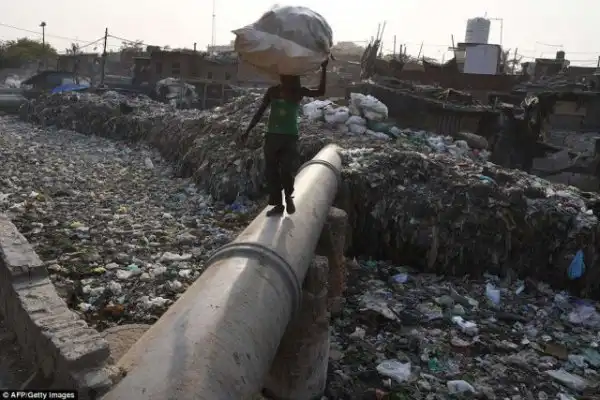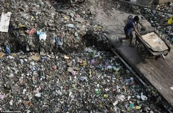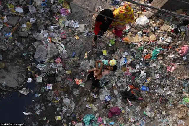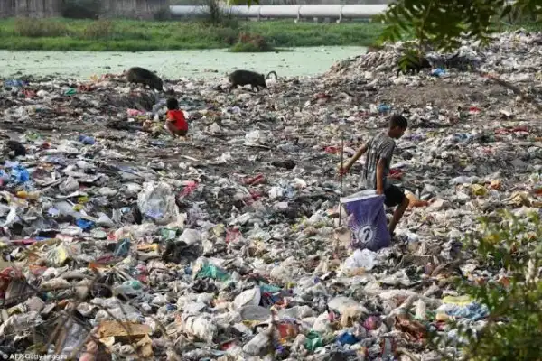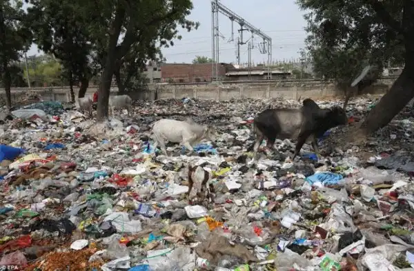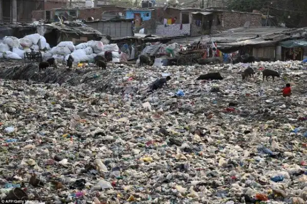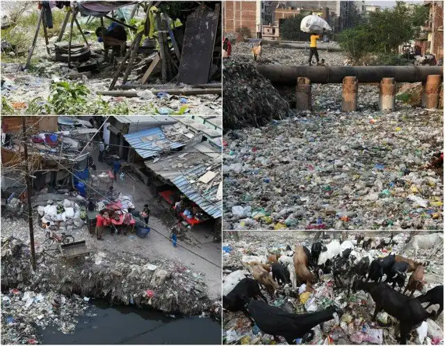 Столица Индии Нью-Дели считается одном из самых загрязненных городов мира. Особенно остро проблема мусора ощущается на окраине столицы, где в трущобах живут бедные люди. Повсюду валяются пластиковые пакеты, бутылки и другой мусор. Бродячие собаки, козы и коровы жуют пластиковые отходы, детишки также играют на кучах мусора.