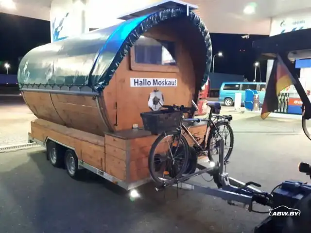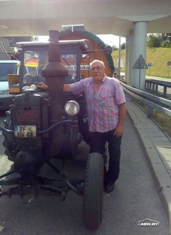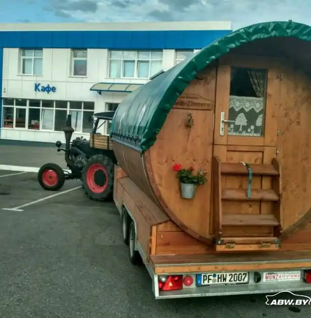 В Россию на чемпионат мира по футболу едет пожилой немец. Мужчина выбрал крайне необычный вид транспорта - трактор. Он путешествует с собакой и буксирует дом на колесах, стилизованный под пивную бочку. Недавно он был замечен на белорусском пункте пропуска "Берестовица". Мужчина очень позитивный, охотно идет на контакт и фотографируется со всеми желающими. Скорость движения его транспорта всего 30 км/ч, но он не теряет оптимизма и говорит, что будет в Москве через 10 дней.