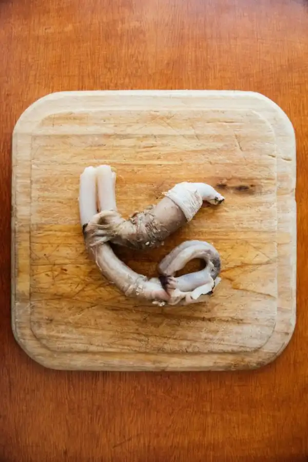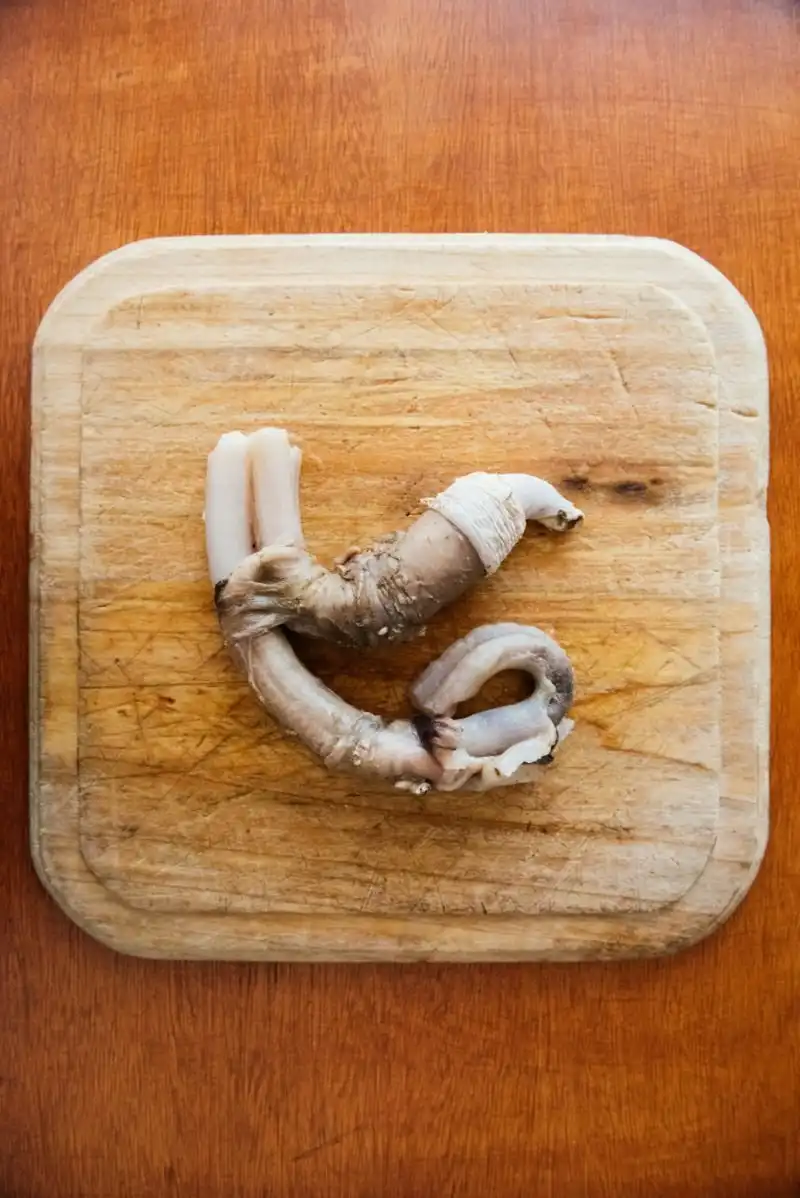 Хозяйство замачивается в 5% соляном растворе на ночь, затем очищается от кожи и пленок. Полученный кусок мяса заворачивается в пищевую пленку и замораживается, после чего нарезается тонкими ломтиками. Получившиеся слайсы оставляют сушиться (на ночь), а потом обжаривают в раскаленном масле с солью и любимыми специями.