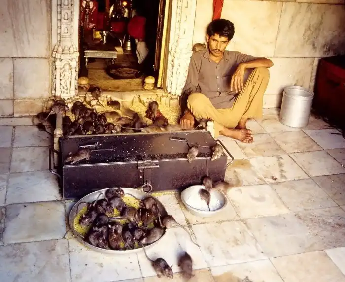 Паломники храма верят, что их умершие родственники воплотились в крыс и в следующей жизни непременно возвратятся в этот мир уже людьми. Посетители из всех уголков Индии несут в храм свои подношения.