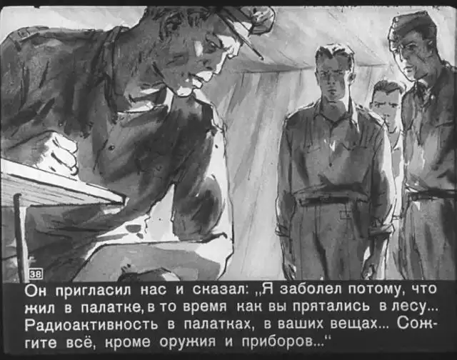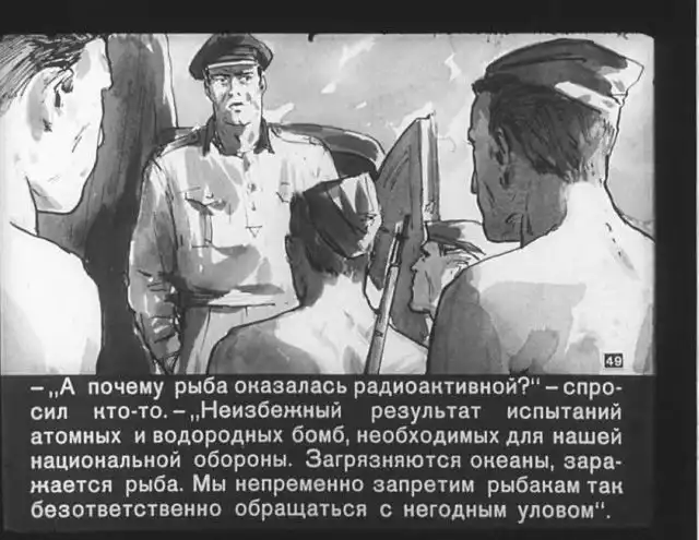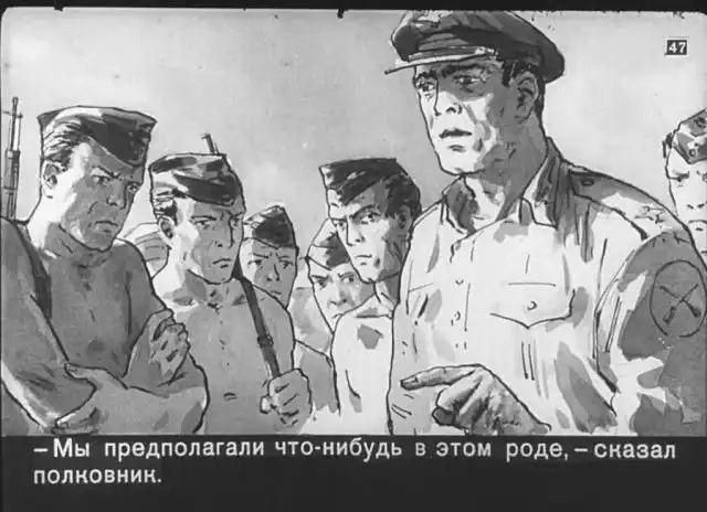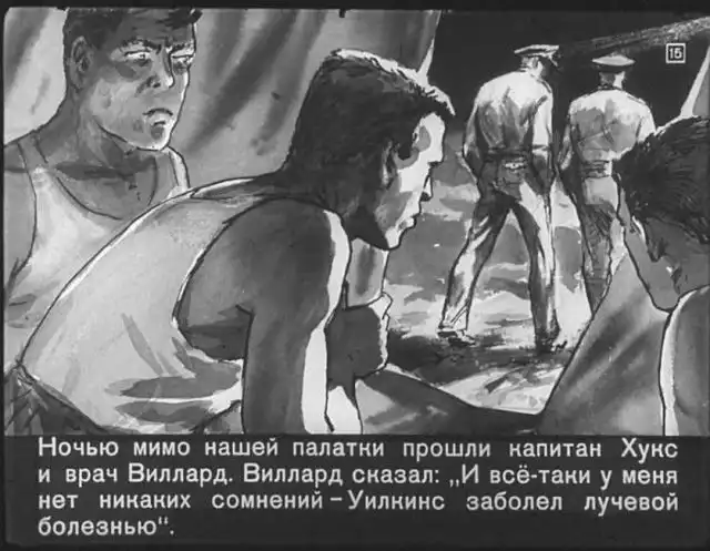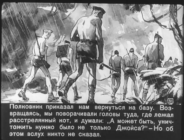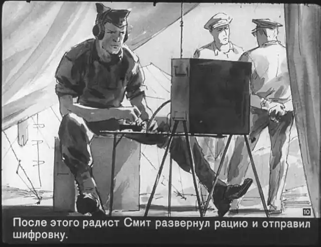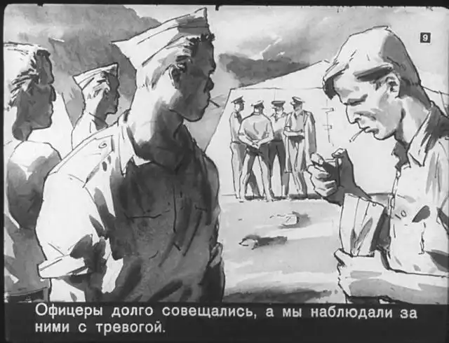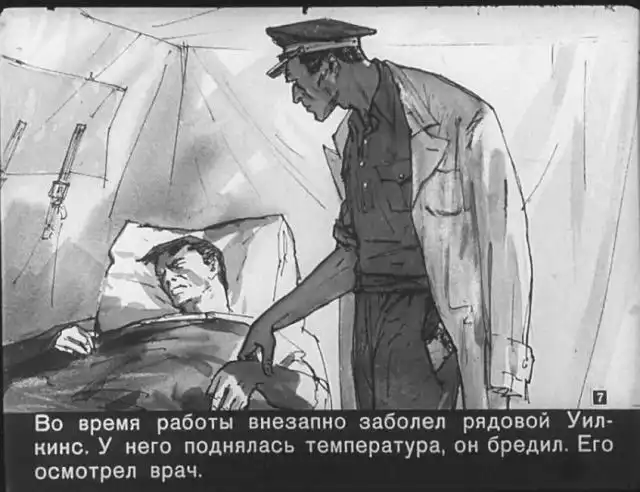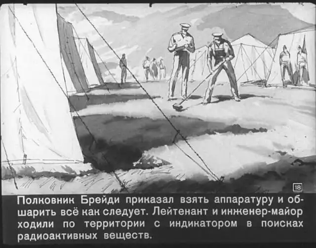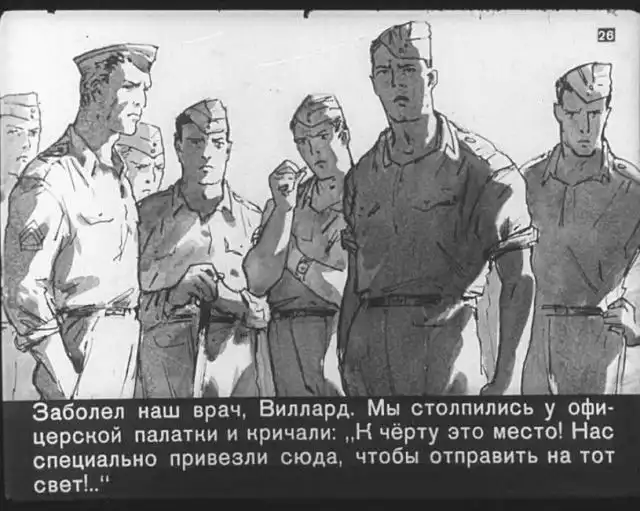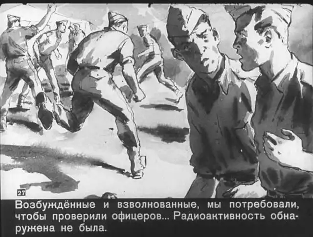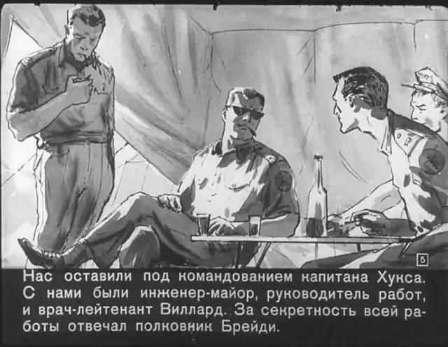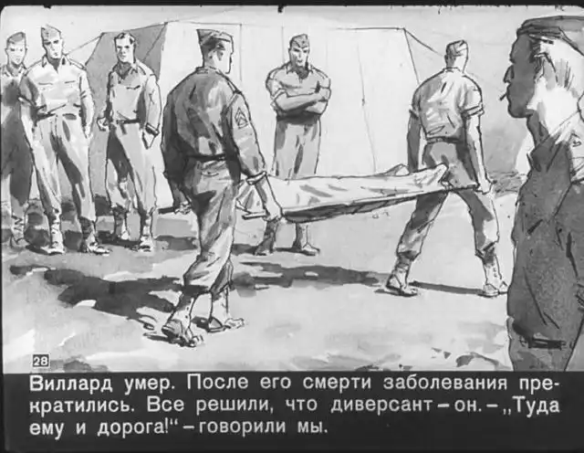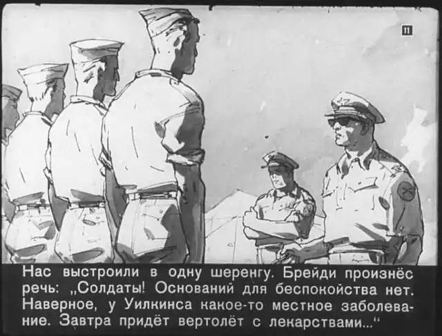 Далее вас ждет советский диафильм 1960 года. В нем описывается череда загадочных смертей на секретной американской ракетной базе, которые офицеры пытаются скрыть от солдат, но сделать это не получается. Диафильм заостряет внимание на проблемах гонки вооружений, экологии и империализма.