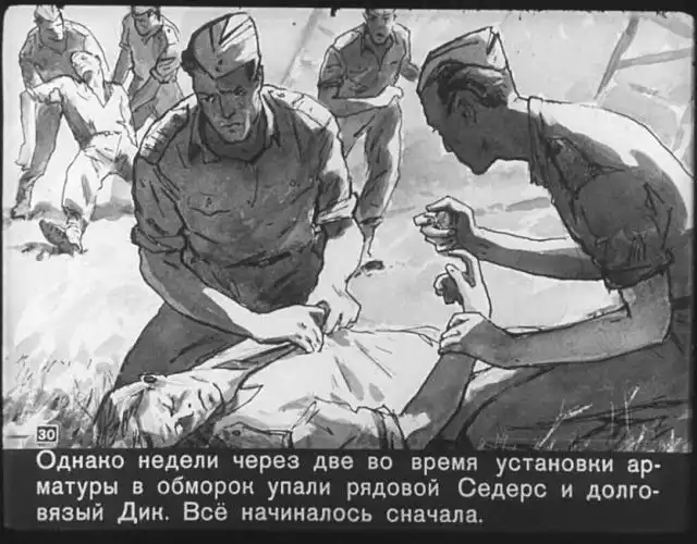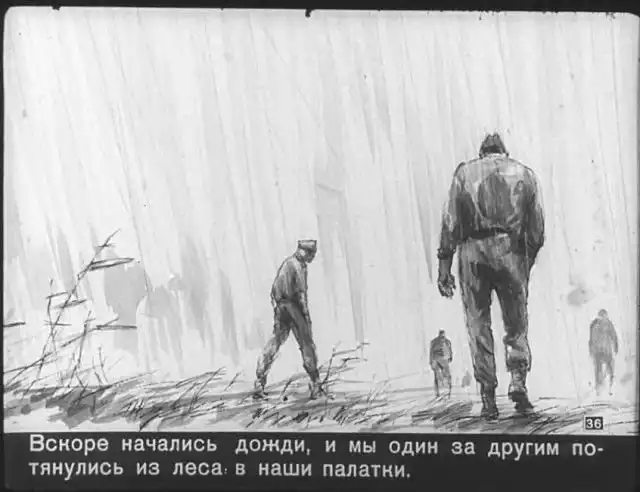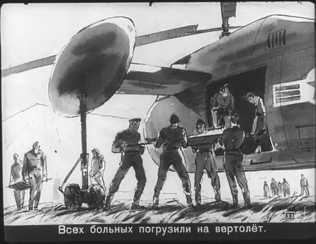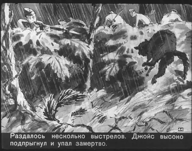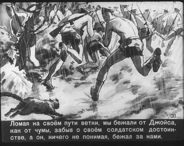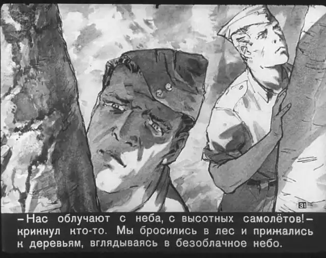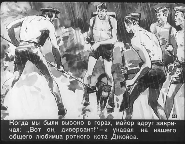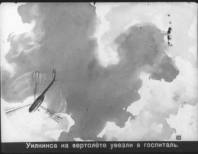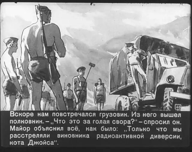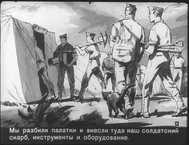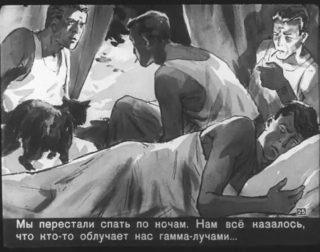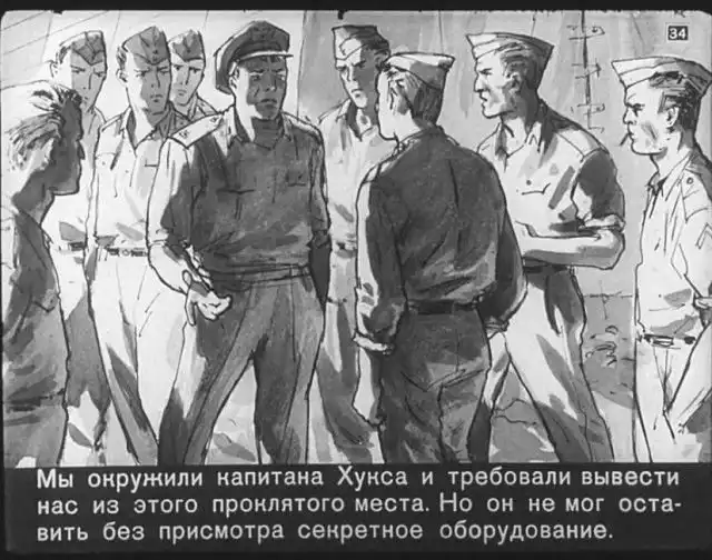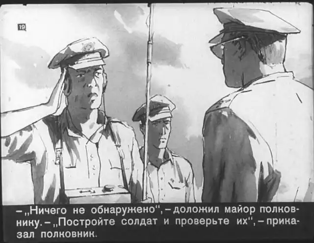 Далее вас ждет советский диафильм 1960 года. В нем описывается череда загадочных смертей на секретной американской ракетной базе, которые офицеры пытаются скрыть от солдат, но сделать это не получается. Диафильм заостряет внимание на проблемах гонки вооружений, экологии и империализма.