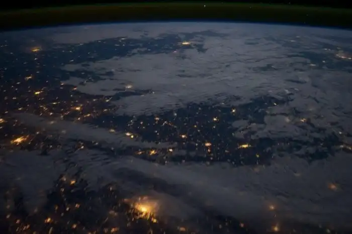 7. Восточная Европа ночью. На переднем (слева) плане Будапешт (Венгрия), Киев и вся Украина в центре и в верхней части фотографии