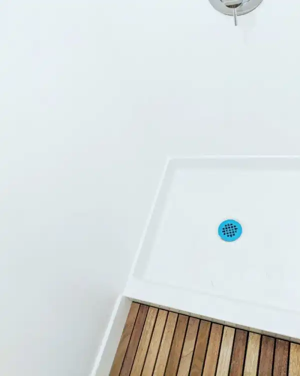 Напольное покрытие в душевой выполнено из красного дерева