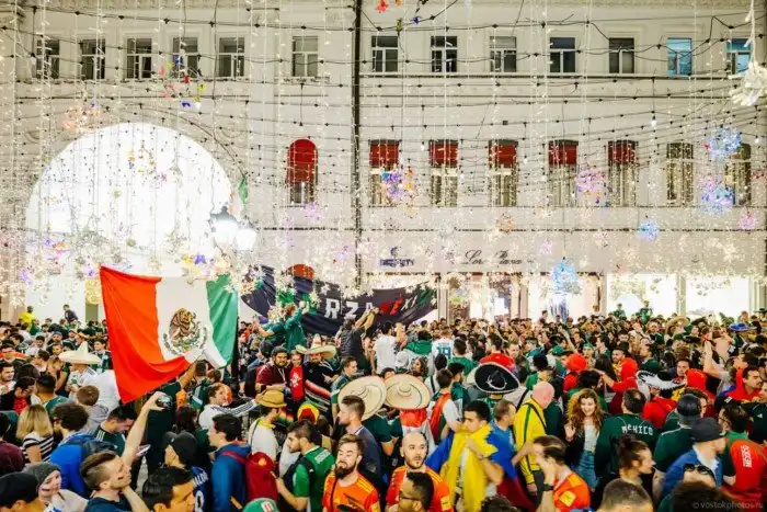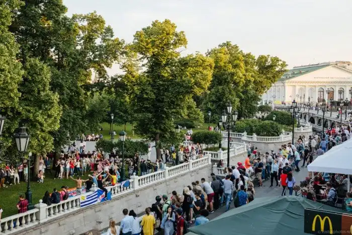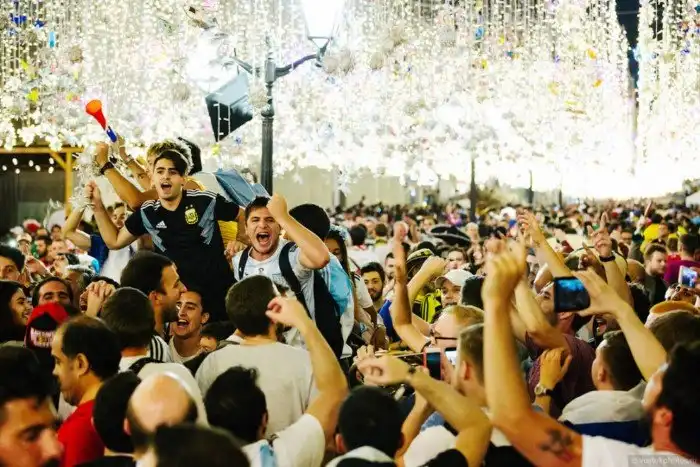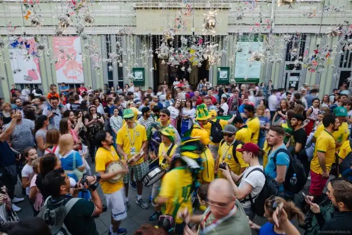 Болельщики выступающих стран то тут, то там собираются в группы и поют свои песни, кричат и веселятся. А остальные их снимают )