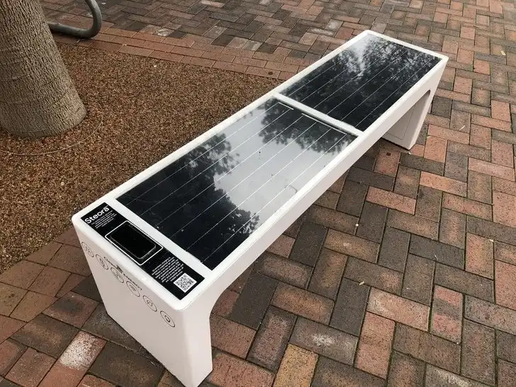 А это лавочка на солнечных батареях, чтобы посетители парка могли подзарядить свой мобильный телефон