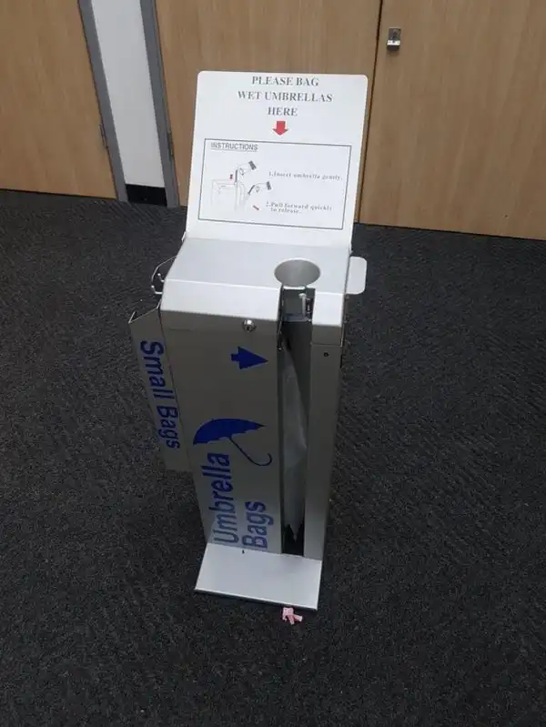 Стойка с пакетами для мокрых зонтов на входе в больницу
