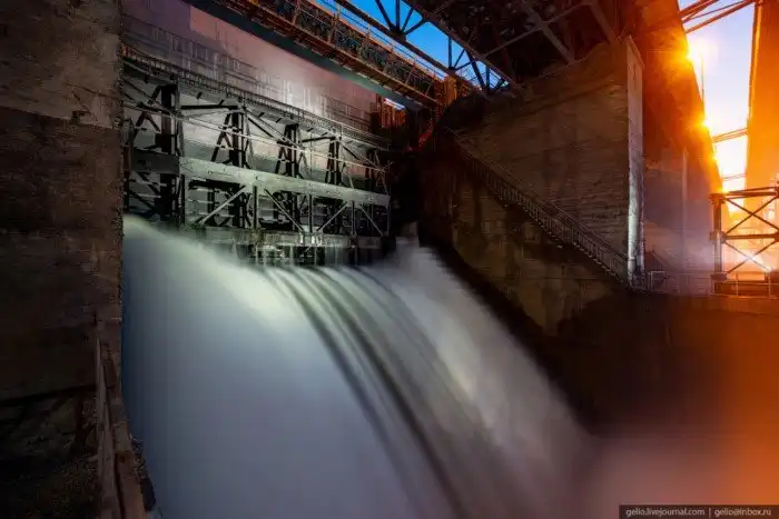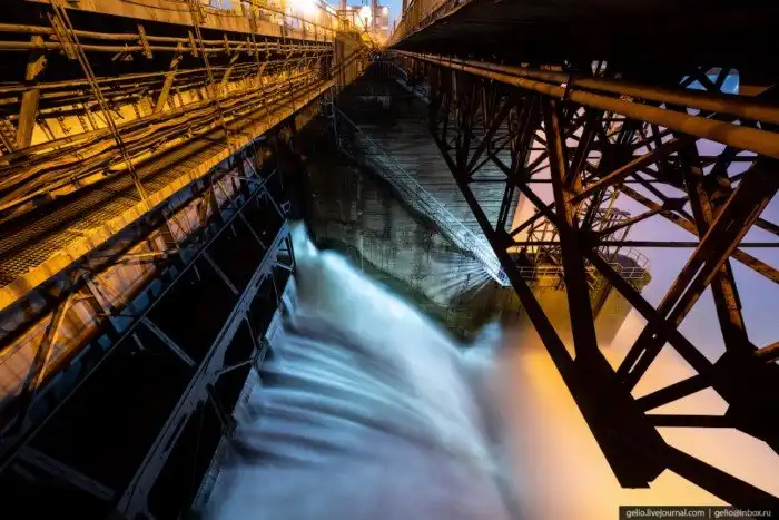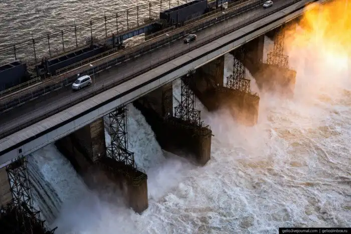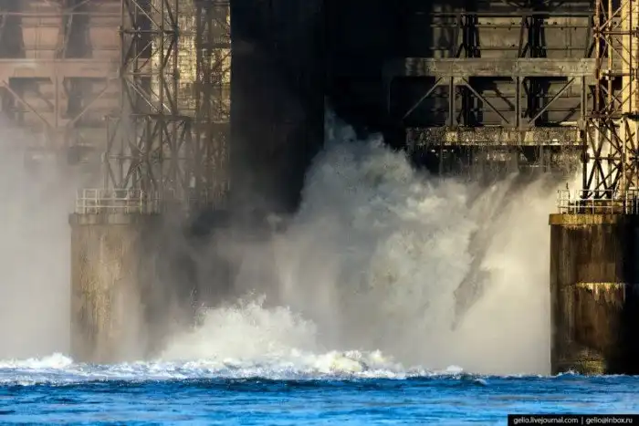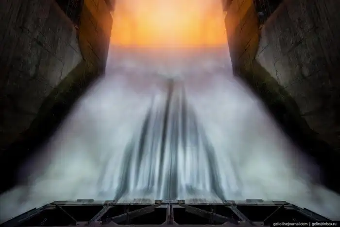 Энергия сбрасываемой воды гасится на водобое — железобетонной плите толщиной в 2–4 метра и длиной в 32,5 метра. На ней в два ряда расположены трапециевидные пирсы-гасители. Плита заканчивается зубчатым порогом. Он резко снижает скорость потока у дна и защищает русло реки от размыва. За ним — 20-метровая рисберма из бетонных кубов и крупного камня. На этом участке гасится остаточная энергия, и скорость потока снижается до бытовой.