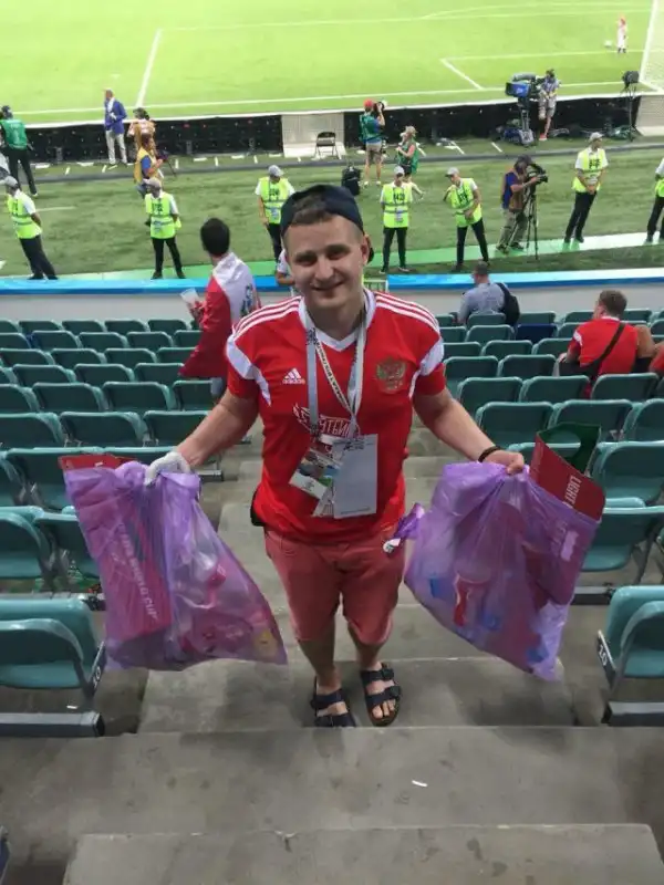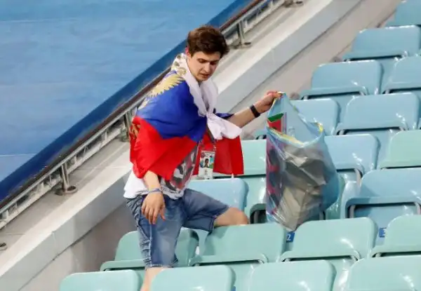 Российские болельщики остались на стадионе, чтобы прибраться после матча.