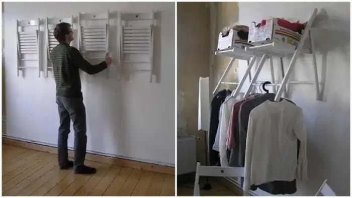 Обычный складной стул можно прибить к стене и получить оригинальную полку