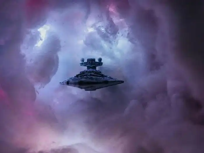 Если вы являетесь фанатами "Звёздных войн", то это фото вам точно понравится. На нем мы видим боевой корабль "Звёздный разрушитель", который как будто выходит из плотных слоев туманности. Смотрится очень интересно, но сделано это фото было довольно просто.