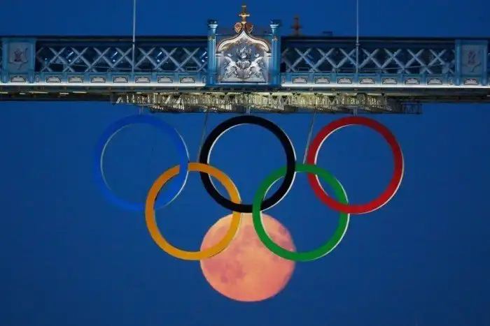 4. Полная луна на фоне олимпийских колец под Тауэрским мостом в Лондоне, 2012 год