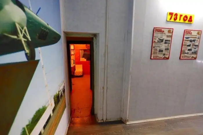 Табличка у неприметного входа в бункер во дворе Самарской гос. академии культуры и искусства (СГАКИ). Раньше в этом здании находился ОБКОМ КПСС. Справа от парадной лестницы в холле обкома партии находилась неприметная дверь, возле которой круглосуточно дежурил сотрудник НКВД. Сразу за ней железная створка, за которой и находился один из главных секретов того времени. Существуют также скрытые запасные выходы, через которые диггеры попадали в бункер. (Фото David Gray):