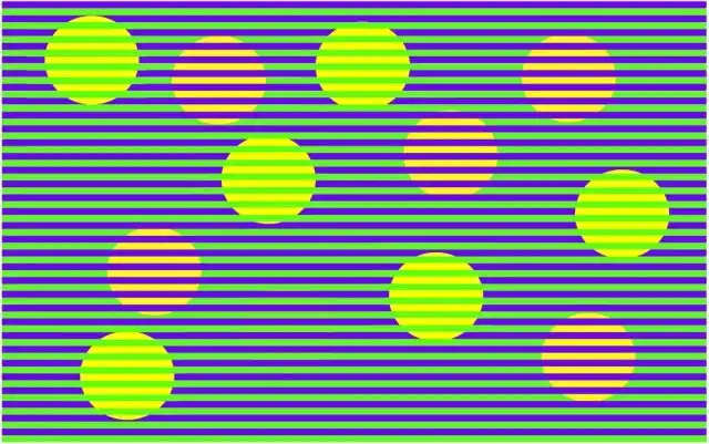 Хоть с первого взгляда может показаться, что все круги на картинке окрашены в разные цвета, на самом деле это не так. Все круги одинакового цвета, но восприятие цвета нарушено из-за горизонтальных линий. Если вы до сих пор сомневаетесь в этом, можете сохранить любую из этих картинок к себе на компьютер, открыть ее с помощью обычного редактора Paint и проверить цвет при помощи инструмента под названием "Палитра" (кнопка в виде пипетки).