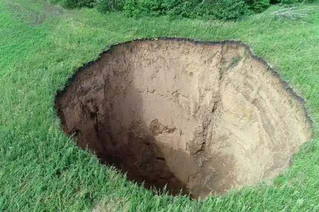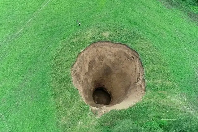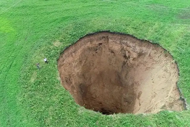 ГУ МЧС по Нижегородской области опубликовало в сети снимки огромного карстового провала, образовавшего воронку в Шатковском районе неподалеку от села Неледино. Подобные провалы образуются из-за размывания грунта подземными водами. Фотосъёмка была сделана с квадрокоптера, а для оценки масштабов вы можете увидеть людей и автомобиль на заднем плане. По предварительным расчетам, диаметр воронки достигает 32 метров, а ее глубина более 50 метров. На дне ямы виднеется грязевое месиво, поэтому не известно, какая реальная глубина до твердой породы.