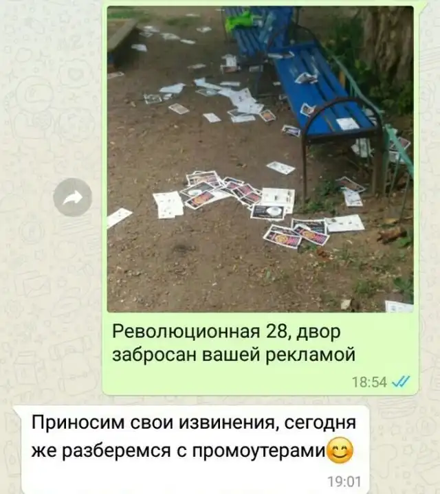 Автор этого поста обратил свое внимание на то, что весь его двор был забросан рекламными листовками. Он взял одну из листовок в руки, нашел номер телефона компании и написал сообщение в мессенджер.