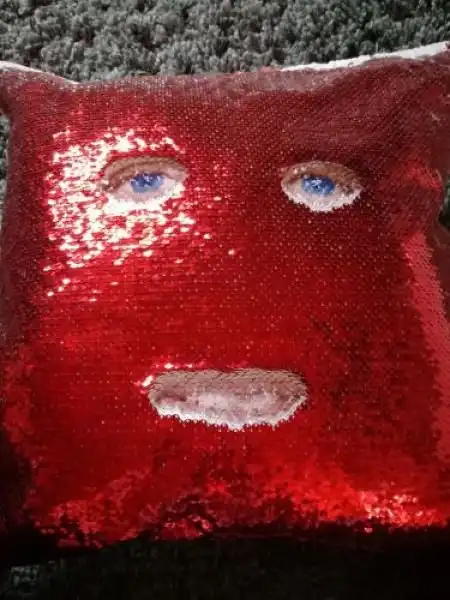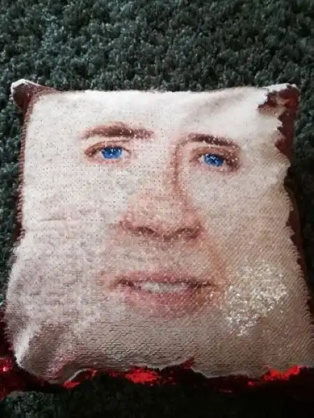 Друзья подарили девушке подушку с вращающимися пайетками: одна сторона - красная, вторая - с лицом актера Николаса Кейджа. Но если неудачно зацепить подушку рукой, и соединить две стороны пайеток, то получается какая-то чертовщина.