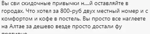 Алтай можно назвать одним из самых перспективных направлений для внутреннего туризма в нашей стране. Нетронутая природа, чистейший воздух, озера и ледники манят сюда российских туристов, но, к сожалению, в подобном отдыхе есть и свои минусы. Одним из основных недостатков является устаревший сервис, который по-прежнему живет парадигмами 90-х годов. В качестве примера предлагаем вам посмотреть на скриншоты общения владельцев одного из Гостевых домов с клиентами.