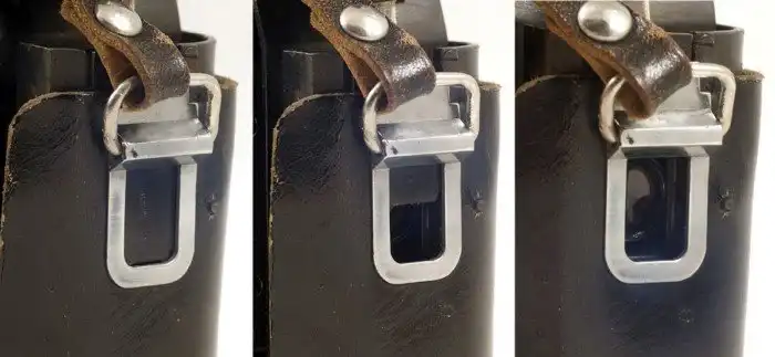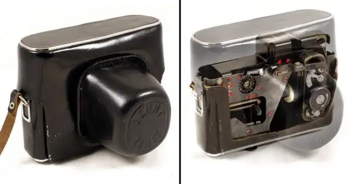 Внешне кажется, что фотоаппарат выключен и упакован в кожаный чехол. Но нажатием небольшой кнопки снизу поднимается заслонка, за которой спрятан шпионский объектив и производится скрытая съёмка.