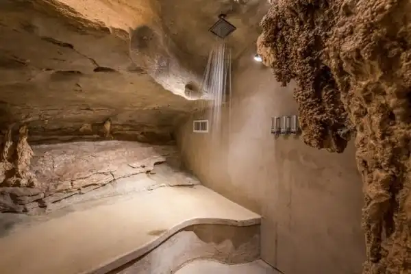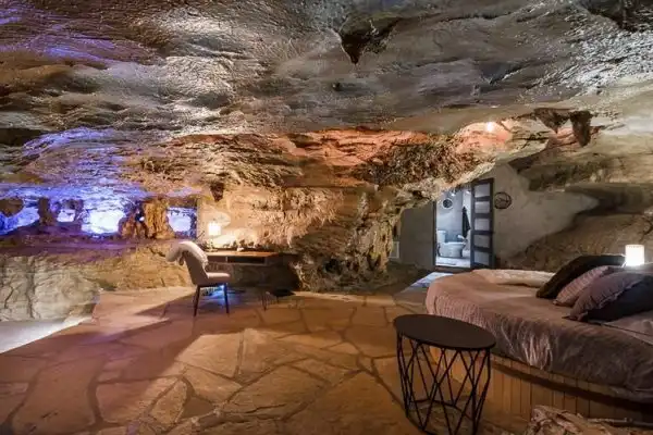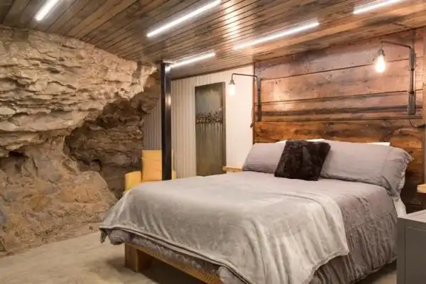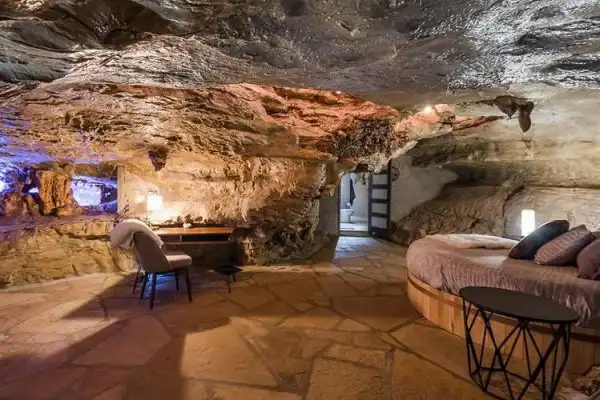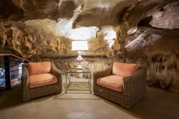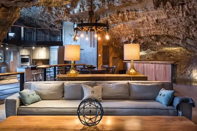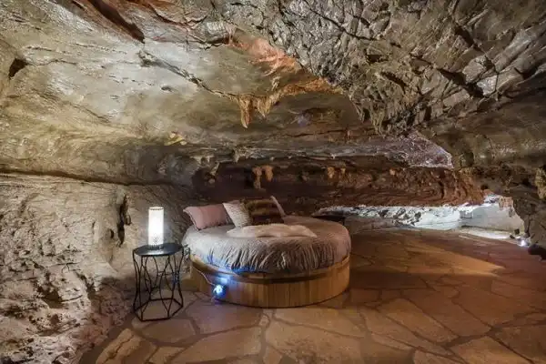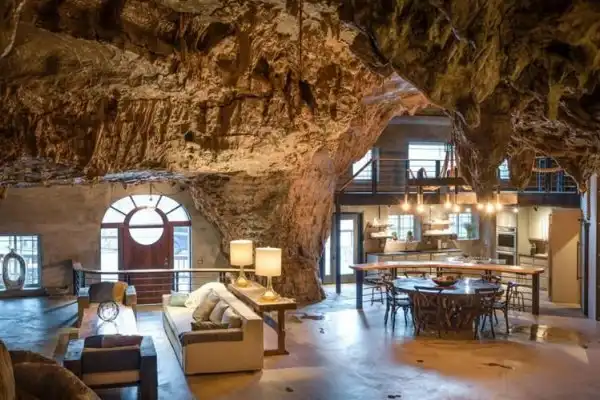 В штате Арканзас продается шикарный особняк в естественной пещере в скале, известный ранее как отель "Бекхэм Крик Кейв". Здесь есть все, что душа пожелает: 4 спальни "люкс" с ванными комнатами, оборудованная по последнему слову техники кухня, современная мебель, недавно отреставрированный крытый водопад, геотермальное отопление, конюшня и посадочная площадка для вертолета.