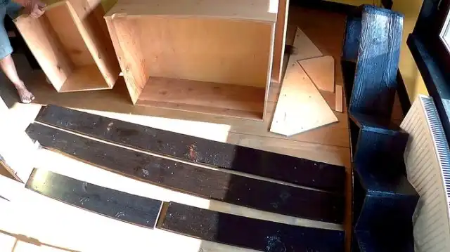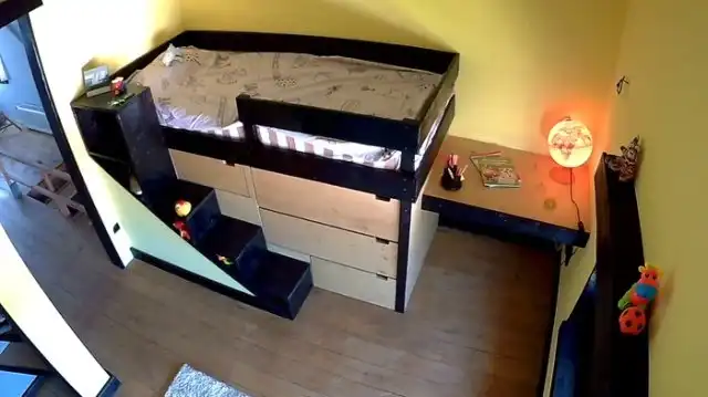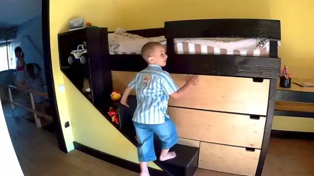 Автор этого поста решил построить для своего сына самодельную кровать, расположившуюся на лестничном подъеме, который "съедал" часть комнаты. Каркас кровати он изготовил из бруса 40*40 мм, который был прикреплен не только к полу, но и к стенам для дополнительной устойчивости. Для обрамления использовались доски 150*25 мм, а полки выполнены из 10 мм ФСФ фанеры. Смотрим далее на результат работы, который получился действительно интересным.