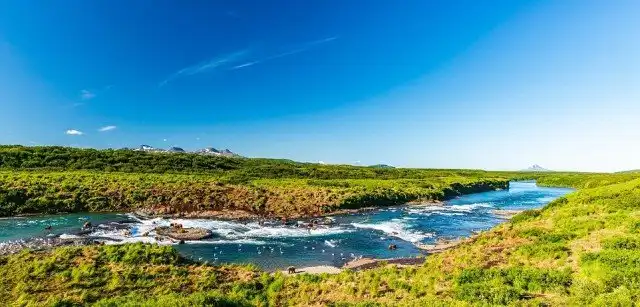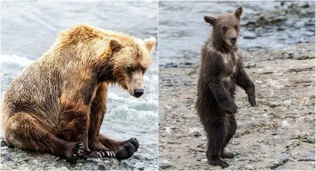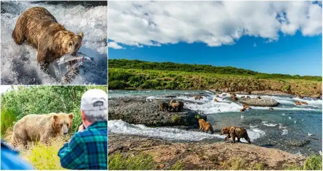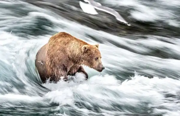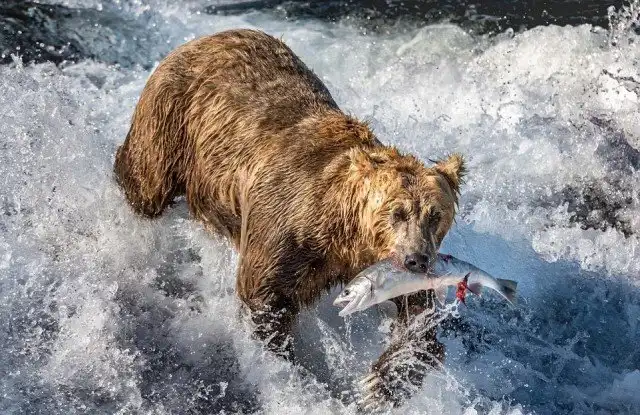Около 100 бурых медведей пришли ловить лосося в реке на Аляске. Бурые медведи на Аляскинском полуострове обычно питаются нерестящимся лососем и используют множество различных способов его ловли. Иногда они поджидают рыбу внизу водопада, иногда ловя лосося лапами или зубами. Свидетелем этих интересных событий стал канадский фотограф Ян Стотсбери (Ian Stotesbury).