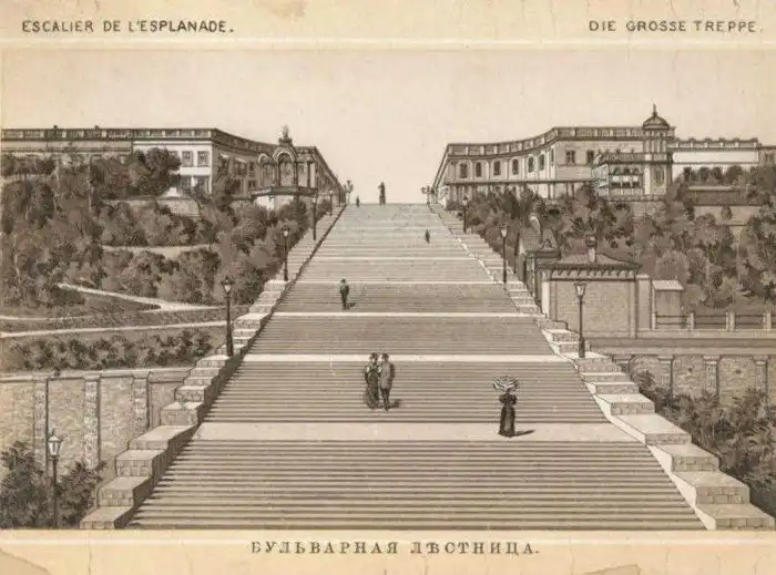 История этой одесской достопримечательности уходит корнями в XIX век. Именно тогда, в 1825 году архитекторами Авраамом Мельниковым, Франческо Боффо и Потье она была спроектирована и несколькими годами позже возведена «на том же месте, где и была тропинка», по которой спускался к морю сам великий Пушкин. Конструкция лестницы для того времени была уникальной. Она представляла собой огромный клин, сложенный из местных известняковых пород, который был зафиксирован на сводчатых деревянных сваях. Поддерживают и разделяют конструкцию три продольные и девять поперечных сводчатых галерей, формирующих массивные столбы на пересечениях. Украшают сооружение архитектурные аркады, сформированные сквозными поперечными галереями на боковых частях монументальной конструкции.