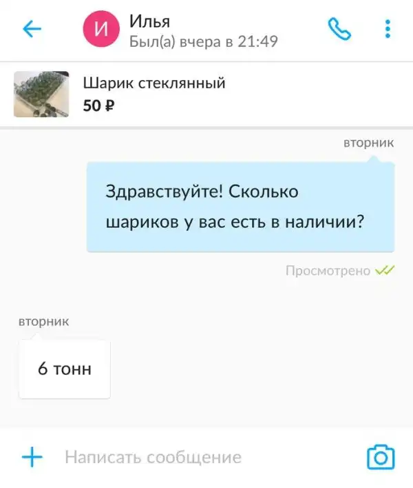 Автор этого поста случайно наткнулся на необычное объявление в сети, когда искал на сайте с объявлениями различный декор для своего нового аквариума. Судя по объявлению, мужчина продает стеклянные шарики, но вот откуда у него могут быть такие запасы, история умалчивает.