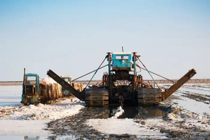 После того, как соль «созрела», а происходит это в конце августа, на работу выходит солеуборочный комбайн. Возраст это диковинной техники, без малого 50 лет, а вес — порядка 25 тонн. Аналогов, как заявляют местные солевары, у этой машины нет, поэтому за ней пристально следят и берегут как зеница ока.