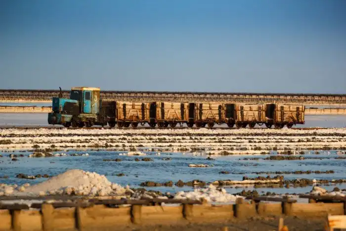 Работа солевара не из простых. Трудиться приходиться в суровых условиях жаркого лета, под палящими лучами солнца. Миниатюрную узкоколейку для вагонеток, монтируют вручную, без помощи техники. За рабочий день, её приходится несколько раз перекладывать, что бы успевать за движущимся комбайном.