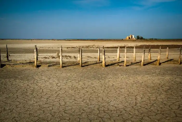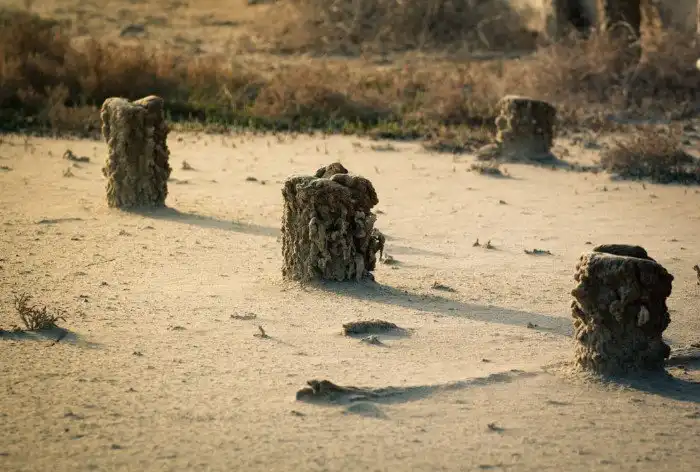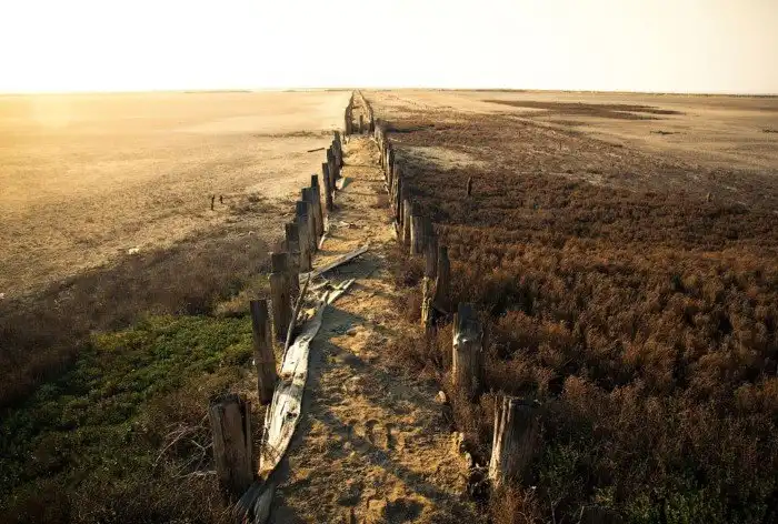 Сейчас на месте бывших соляных бассейнов остались лишь деревянные столбики да сухая земля, сильно напоминающая пустыню, но именно это сочетание и привлекло мое внимание.