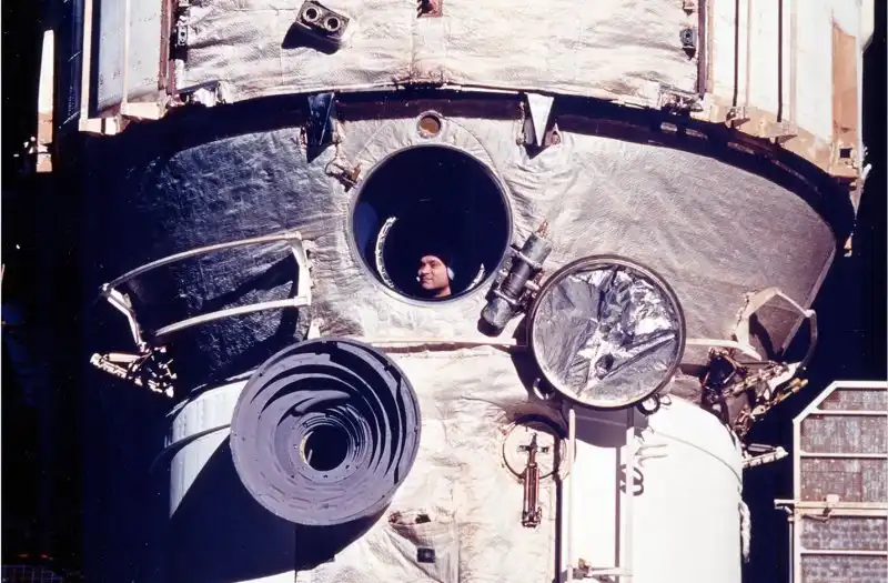 Герой Советского Союза и Герой Российской Федерации доктор медицинских наук подполковник Поляков (дольше всех пробыл в космосе за один полёт — 437 суток) наблюдает в иллюминатор за приближением шаттла «Дискавери». Научно-исследовательская орбитальная станция «Мир», 3 февраля 1995 года.