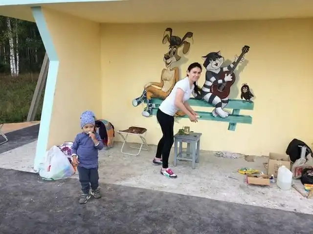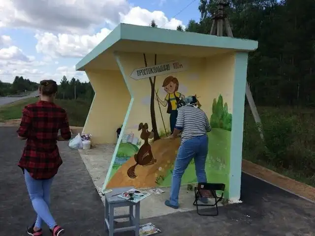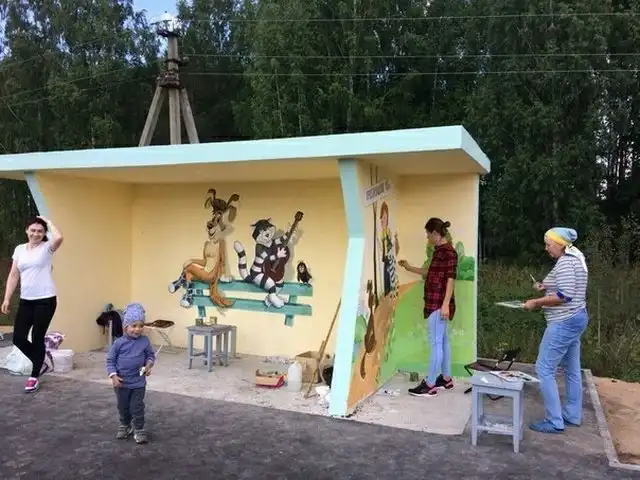 Жители деревни Простоквашино в Нижегородской области решили в тематическом стиле украсить свою автобусную остановку. Всего за несколько часов скучная остановка превратилась в настоящее произведение искусства с качественными рисунками главных персонажей из известного мультфильма под названием "Простоквашино".