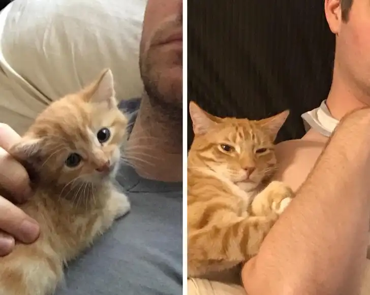 «Муж подобрал котенка на улице. Даже спустя год малыш обожает лежать на его плече»