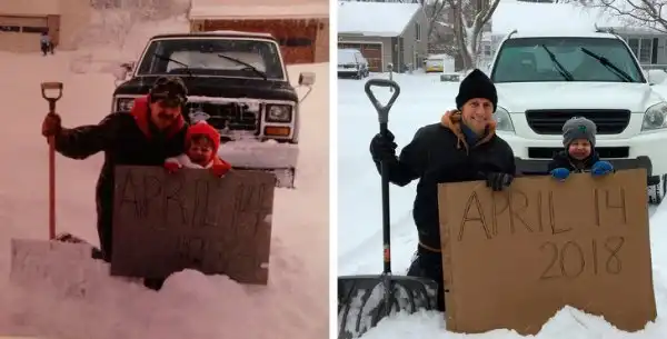 «После такого же сильного снегопада мы с сыном повторили фото, которое мы сделали с моим отцом 35 лет назад»
