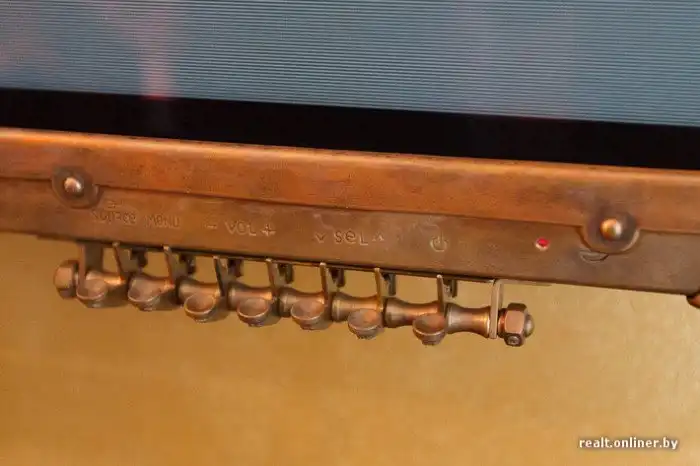 Теперь телевизор в медном «чехле», все кнопки рабочие (их дизайн был позаимствован у духовых музыкальных инструментов). Единственная бутафория на нем — расположенный рядом с клавишами змеевик, это просто украшение.